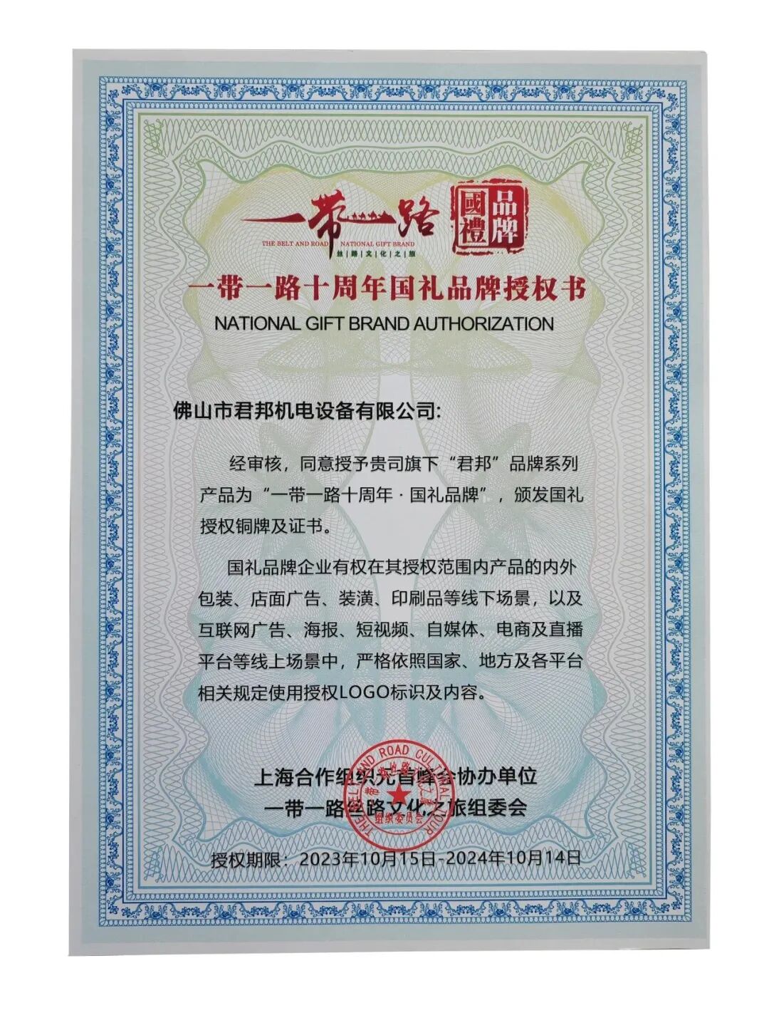 逢此盛会,热烈祝贺佛山市君邦机电设备有限公司旗下“君邦”品牌荣获“一带一路"十周年国礼品牌荣誉称号。 我们将始终秉承“服务至上,客户第一”的宗旨,努力研发更好的焊割设备回馈用户。